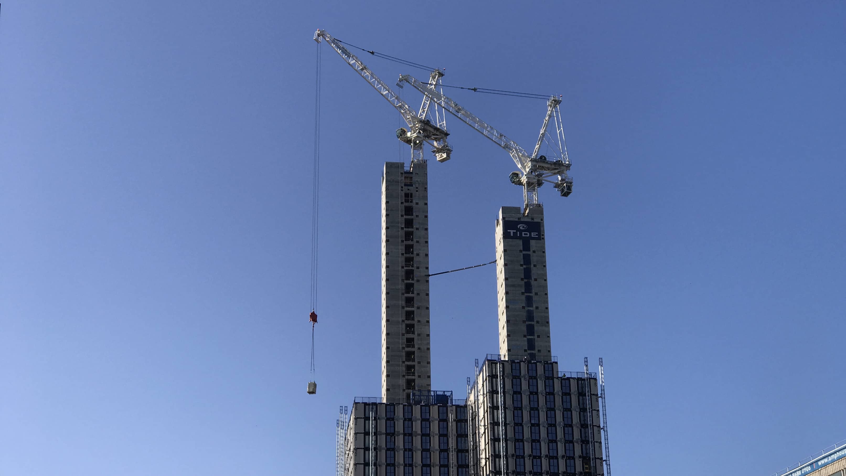 Slowly a new development is creeping skyward. A quicker and cleaner method of construction is being employed.