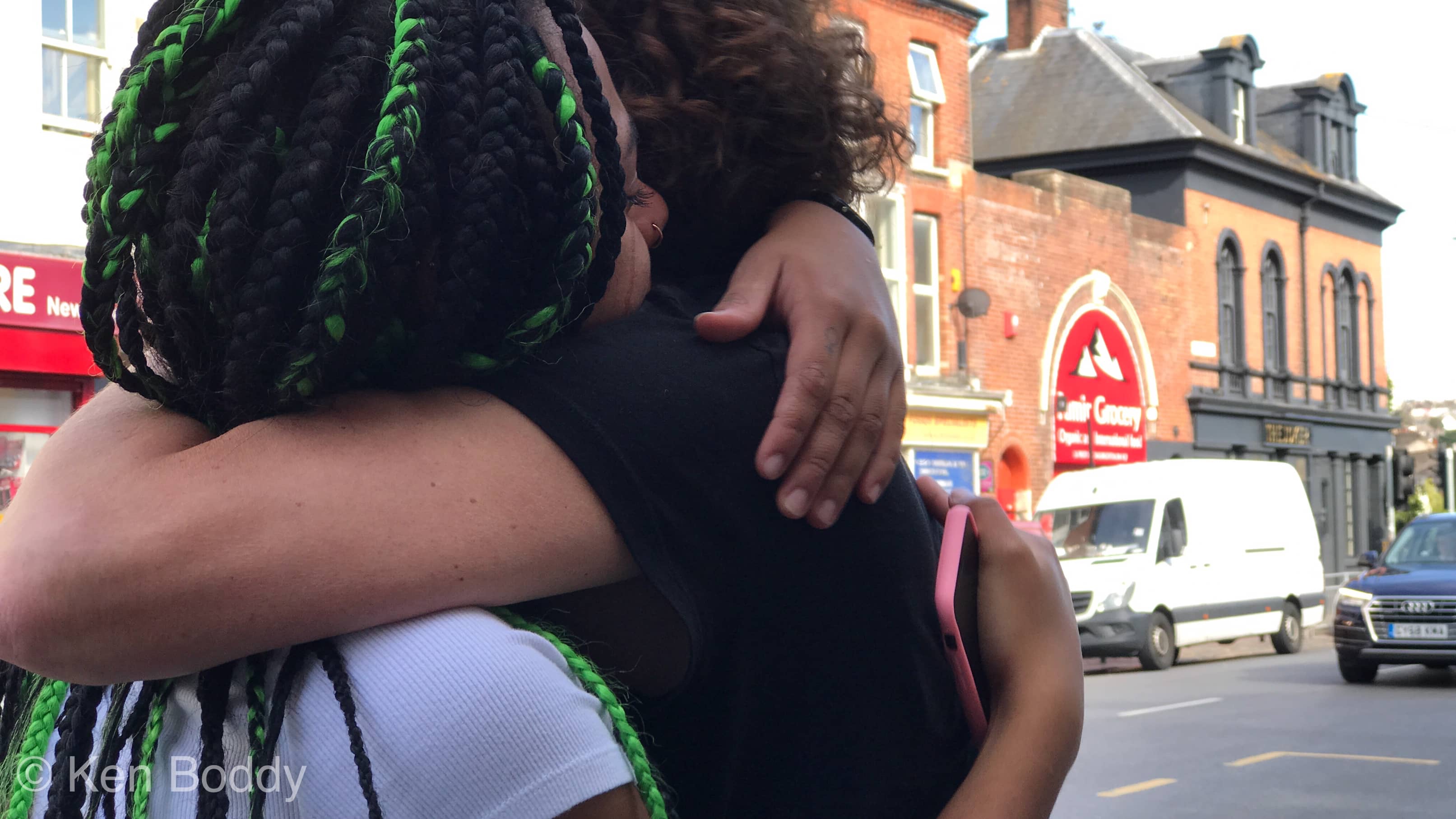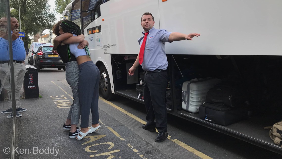Hugs start and tears well up. Coaches pass and then a coach indicates he is about to pull over and stop.