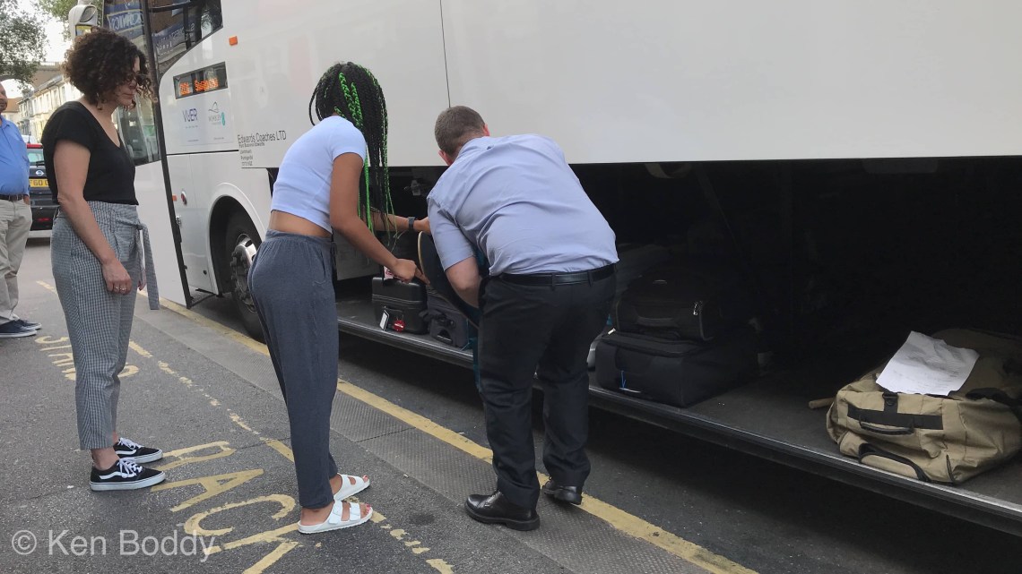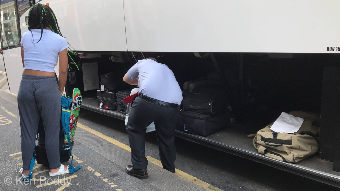 Two people arrive at a National Coach stop and wait, looking at each other every now and then and the cases and back pack lead me to believe a journey is starting but only for one.