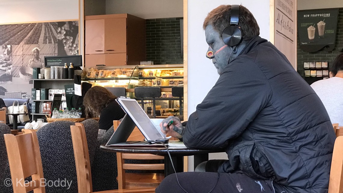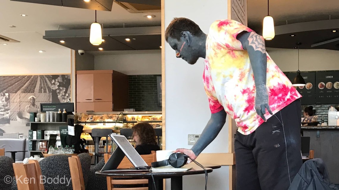 At first I thought he was on a stage-do and in fancy dress, I took no more interest and carried on working – it is Brighton. Time past and I looked around and he had taken up residence and was working. More time past and two cups of tea later for us both I concluded he was not on a stag-do, see I am quick like that 🙂