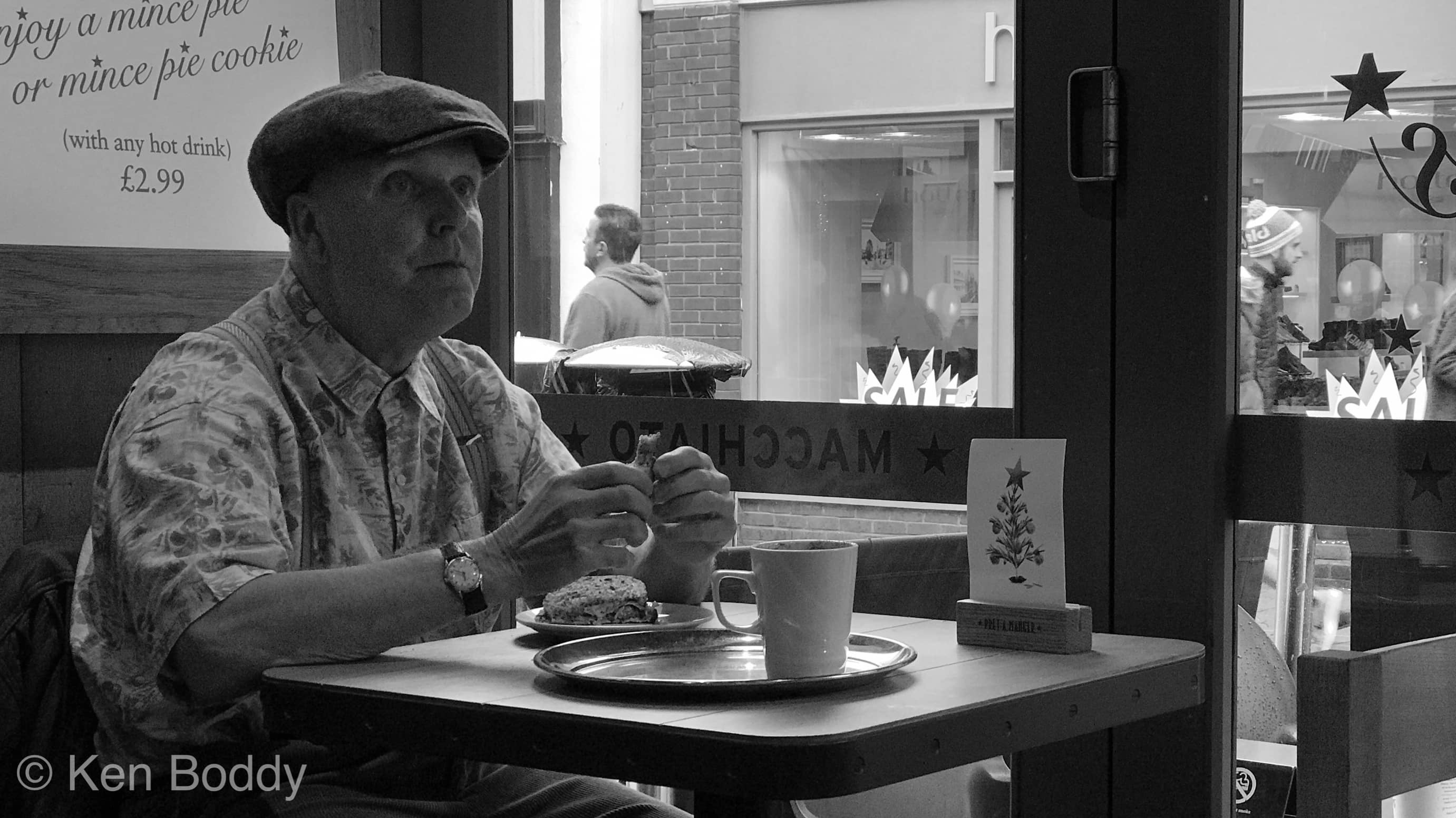 This chap was very happy, well I think he was. He came in to the coffee shop and put his drinks and eats down, took of his coat.