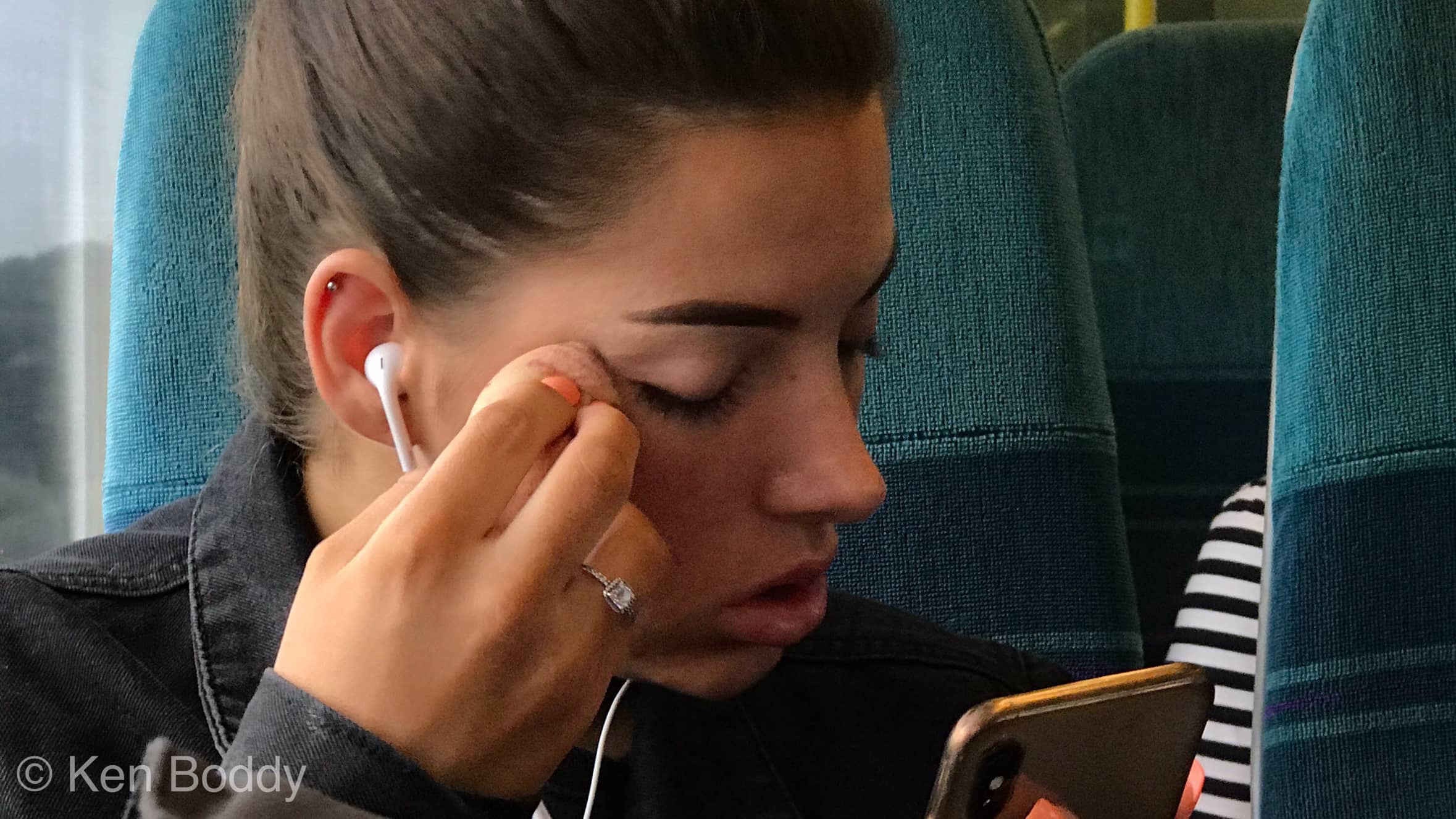 It is very common to see ladies putting on makeup on the train. I can hardly drink a coffee through a tiny letterbox opening let alone trust my self with a pointy object near my eye