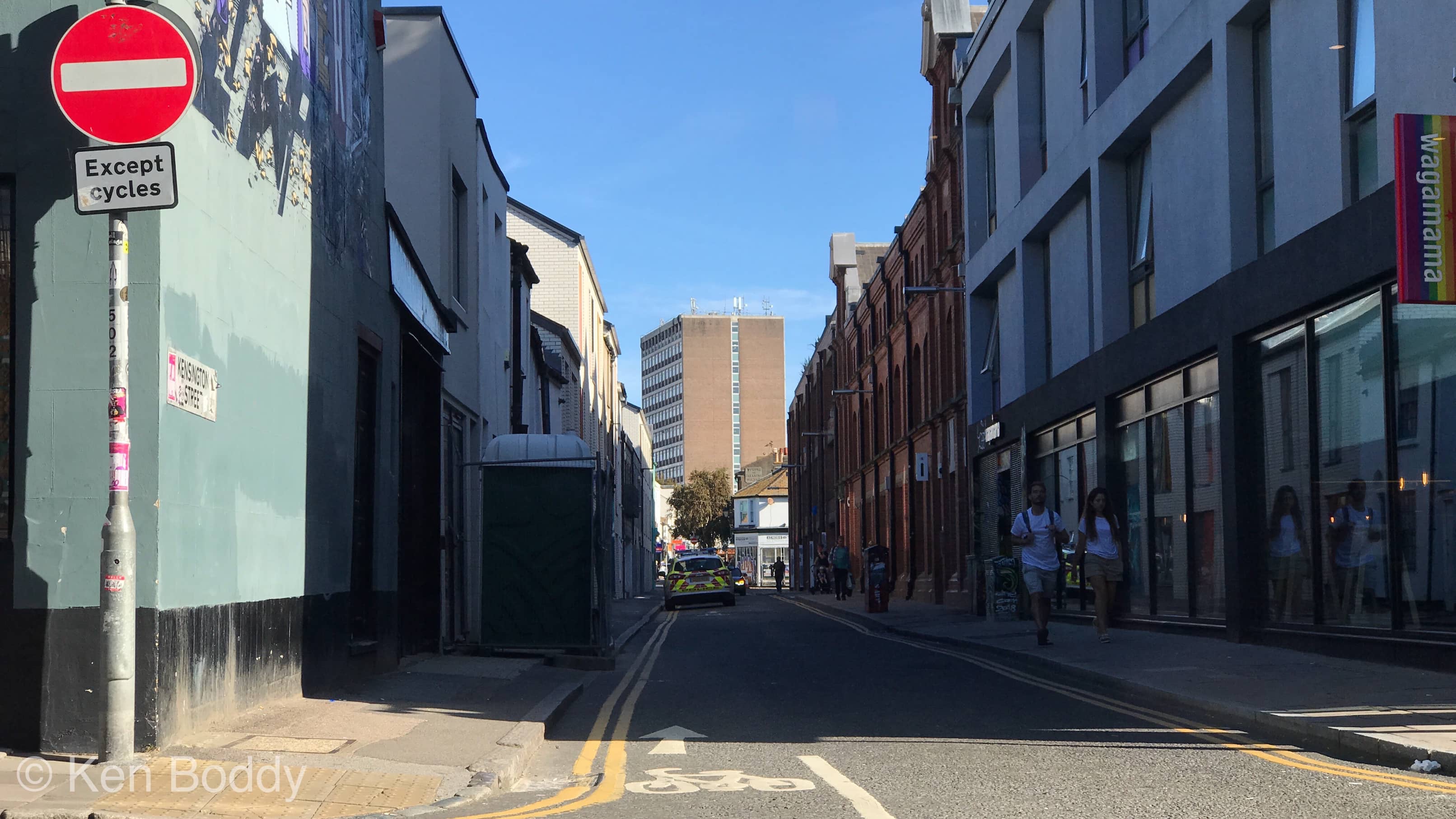 I looked harder … and it became apparent … one-way street with a car parked facing the wrong way. Ah! Got it!