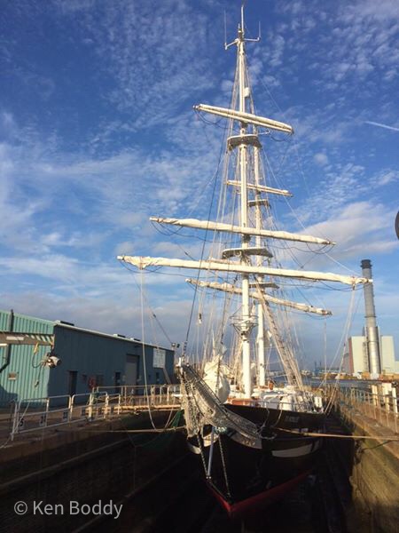 On an evening walk across the lock gates at Shoreham Harbour, in a dry dock was this wonderfully rigged ship